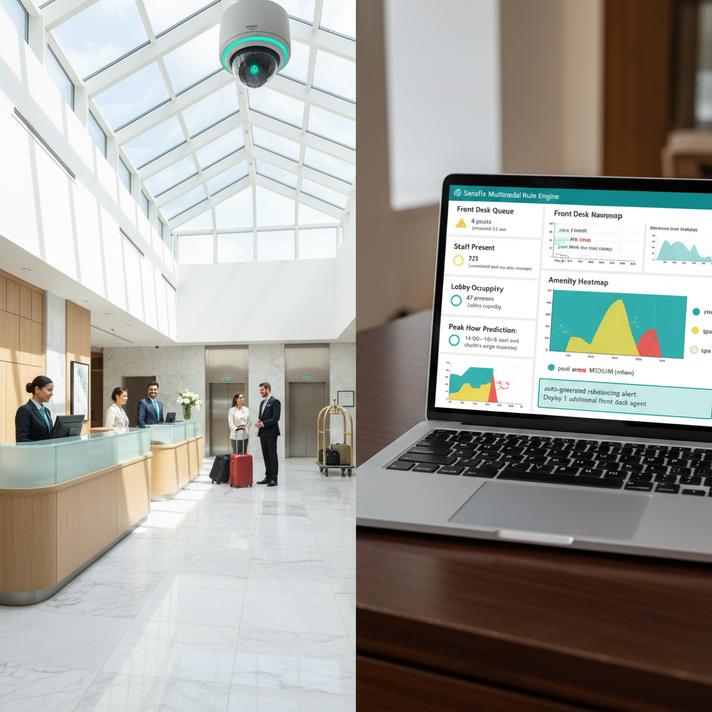 The Multimodal Rule Engine on CCTV for staff presence plus guest flow analysis, using the same people counting and dwell-time analytics proven across commercial building deployments on 3 continents. ServiceScanAI provides queue detection and occupancy counting.