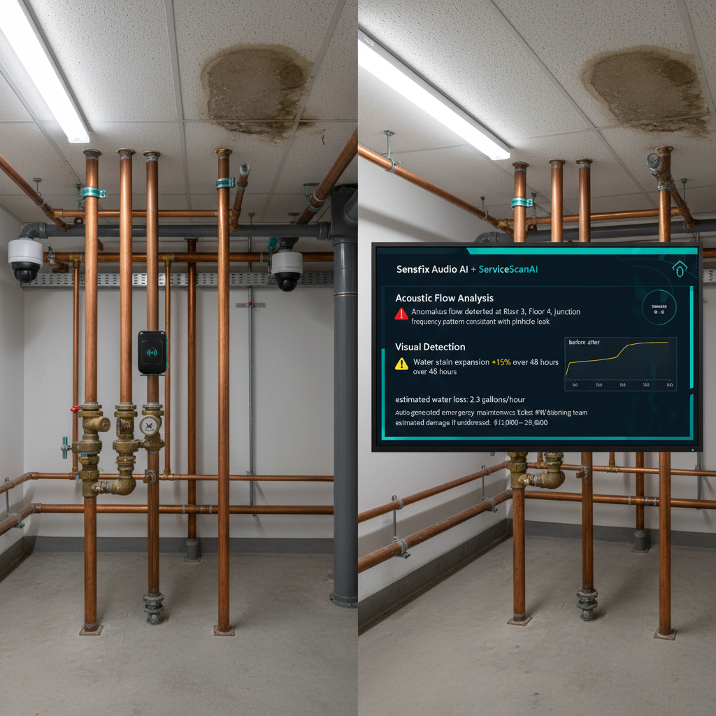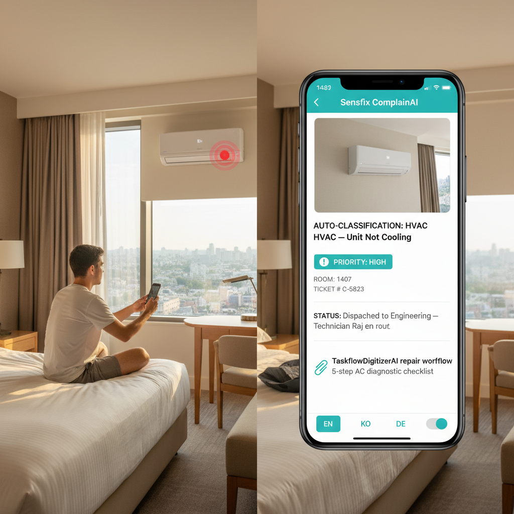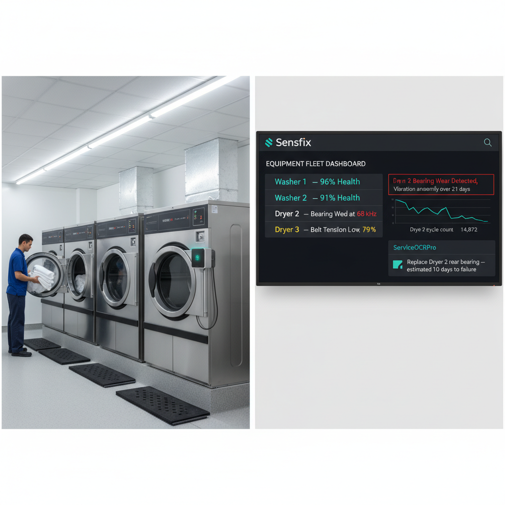 Audio AI and vibration sensors monitor for bearing wear, belt degradation, motor imbalance, and other mechanical issues. ServiceOCRPro reads equipment panel displays. TaskflowDigitizerAI digitizes laundry equipment maintenance SOPs with photo evidence. A greenfield opportunity for Sensfix to establish the first hotel-specific reference case.