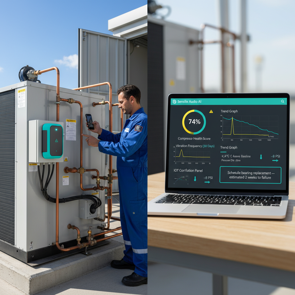 Audio AI Rule Engine detects compressor anomalies 2–4 weeks before breakdown, using the same acoustic fingerprinting technology proven at the world's second-largest train manufacturer for compressor health monitoring on rolling stock. IoT sensors on compressor housings continuously monitor vibration frequencies and power consumption.
