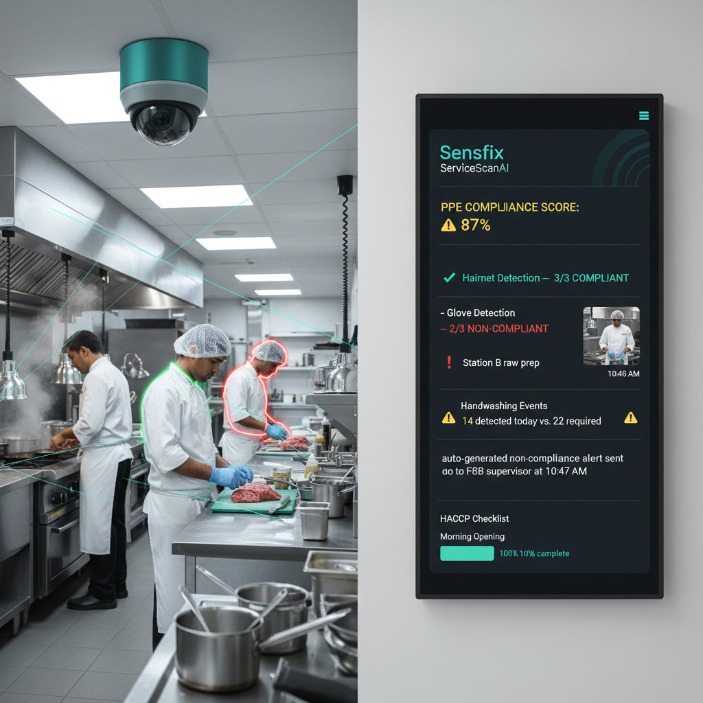 Deploy AI overlay on existing kitchen CCTV for PPE compliance, handwashing frequency, and food safety protocol adherence. Deliverable: compliance dashboard with timestamped evidence for health inspections, time savings quantification.