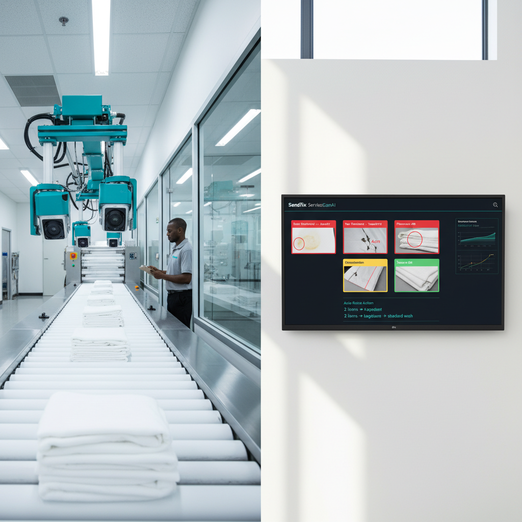 The Multimodal Rule Engine auto-routes defective items for targeted treatment versus standard wash, reducing chemical usage and extending linen lifecycle. No dedicated textile inspection hardware required; high-resolution cameras integrated into existing laundry processing lines provide the image feed.