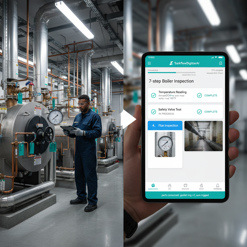 TaskflowDigitizerAI, the same free-form workflow builder proven at 5G Smart Factory and across 46 enterprise clients on 3 continents, digitizes any maintenance procedure: elevator inspection, generator testing, pool chemical rounds, room deep-cleaning. Facility managers create digital workflows; technicians swipe through steps on the mobile app, capturing photo/video evidence at each stage.