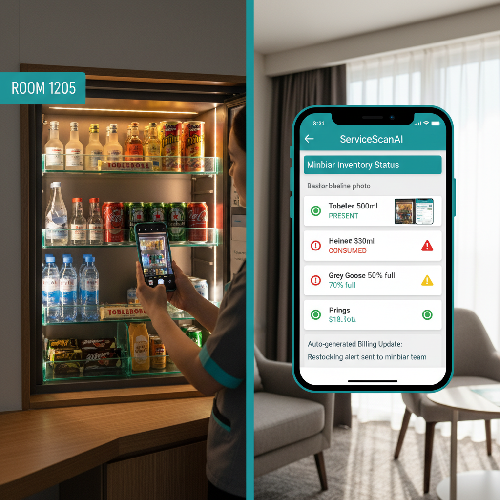 ServiceScanAI photographs minibar contents and compares against stored baselines, the same image-to-image comparison logic used for room damage detection. No sensor-equipped shelves or weight-based detection units required.