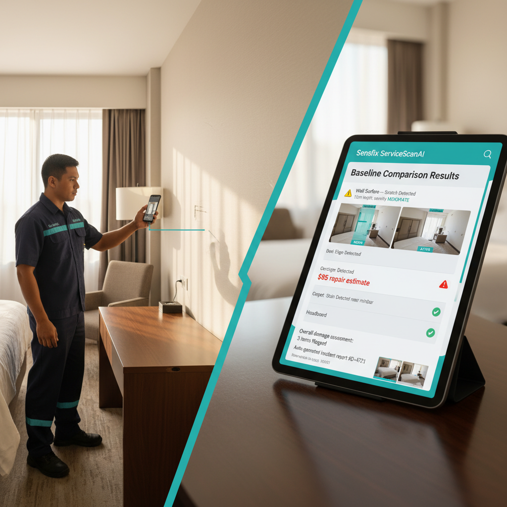 ServiceScanAI's baseline comparison capability, the same technology used at Bay Area automaker for vehicle body panel damage detection, applies directly to room furnishings. Post-checkout photos are compared against a stored "golden record" baseline using semantic change detection that flags meaningful changes while ignoring lighting and angle differences.