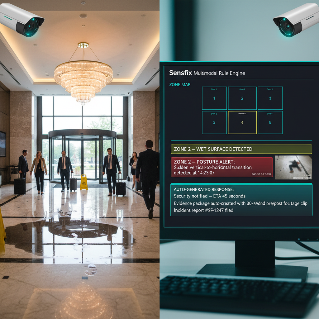 Slip-and-fall claims are the single largest liability exposure for hotels. Without real-time detection, injured guests may lie on the floor for minutes before discovery. Post-incident, hotels lack timestamped video evidence to defend against fraudulent claims. Insurance premiums are driven by claim frequency.