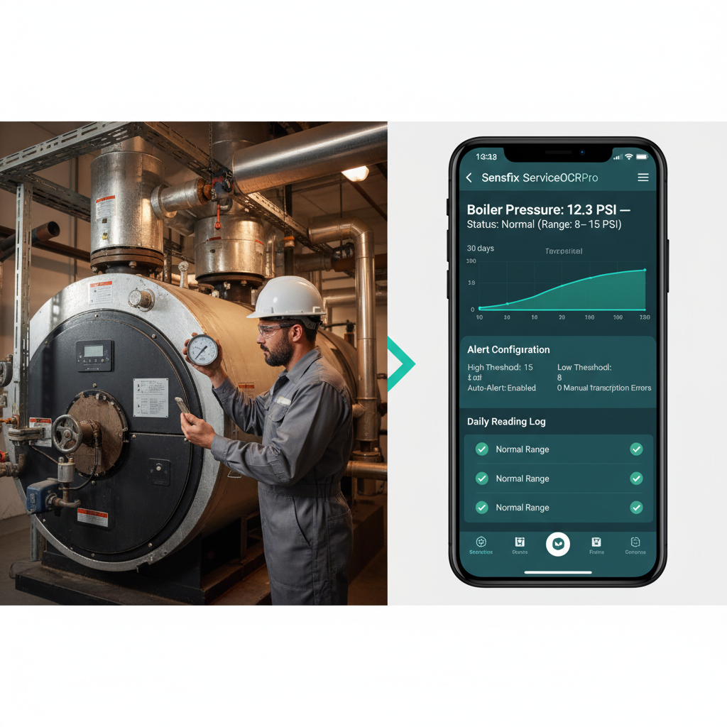 ServiceOCRPro reads boiler gauges and HVAC panel displays, proven at Cadagua wastewater facility. This is a direct Sensfix core competency, not an adjacent technology transfer. The same platform also handles facility inspections, compliance, and safety, eliminating the need for separate predictive maintenance vendors.