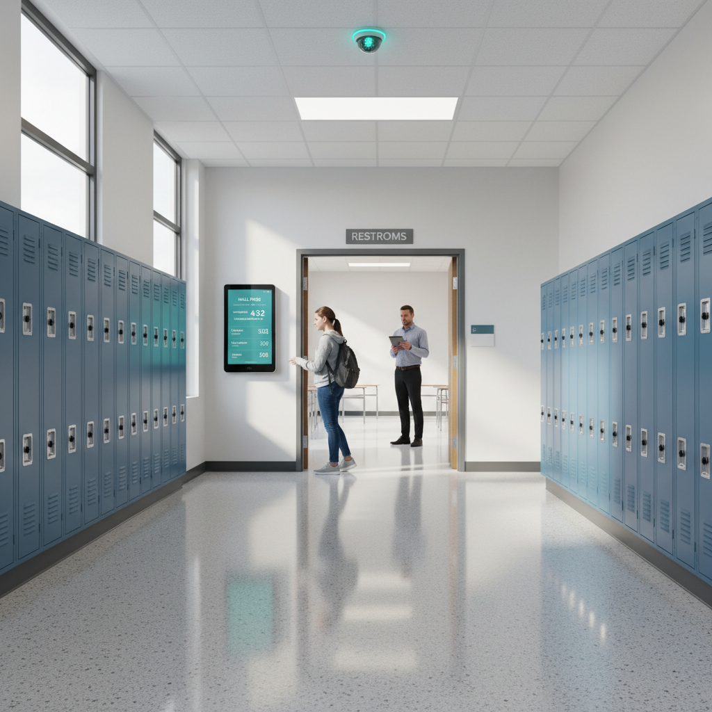 Sensfix CV analytics on hallway cameras can complement digital hall pass systems by monitoring actual student movement and detecting loitering or unauthorized gatherings, the same people counting and dwell-time analytics proven at commercial buildings on 3 continents.