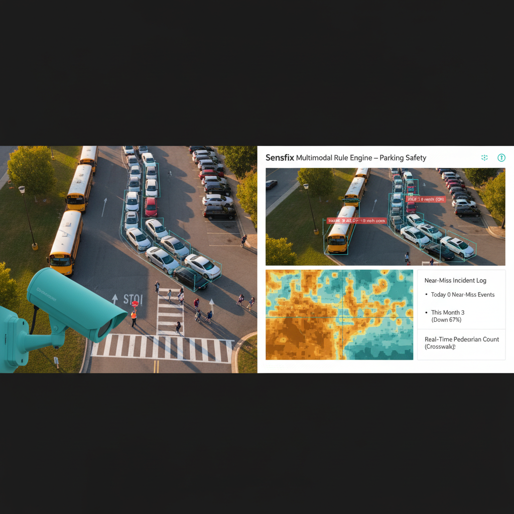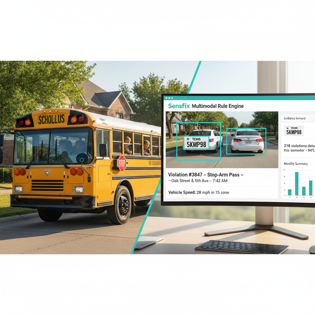 Sensfix Multimodal Rule Engine on bus exterior cameras, the same vehicle detection and license plate recognition technology proven at Port of Tampa for container truck tracking with <1% error rate. CV models verify stop-arm deployment and detect passing vehicles. Rule engine auto-generates evidence packages with timestamped footage.