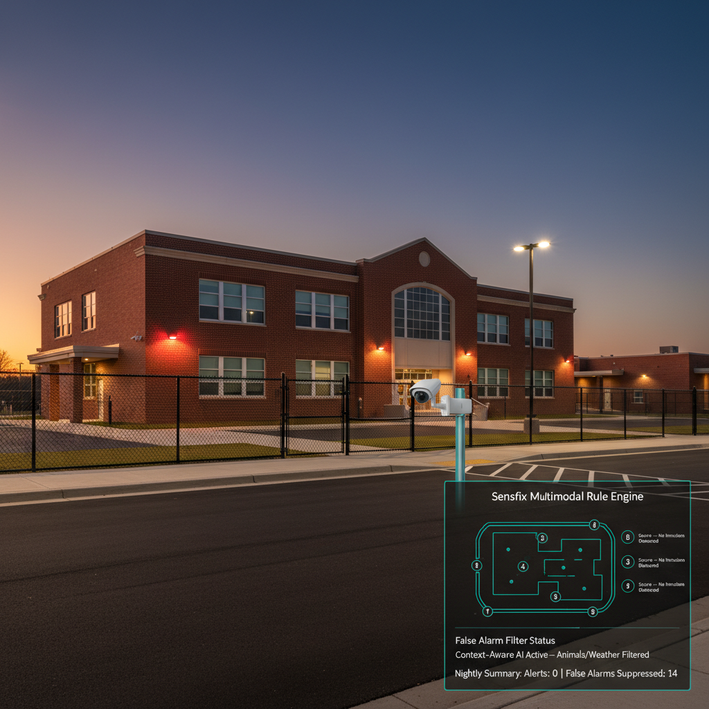 Schools are targets for after-hours vandalism, break-ins, and trespassing. Passive CCTV recordings are reviewed only after incidents occur. Motion-activated alarms generate massive false alarms from animals, weather, and passing vehicles. Security guard costs run $25–$30 per hour per position. Schools lack real-time intrusion detection and response capabilities.