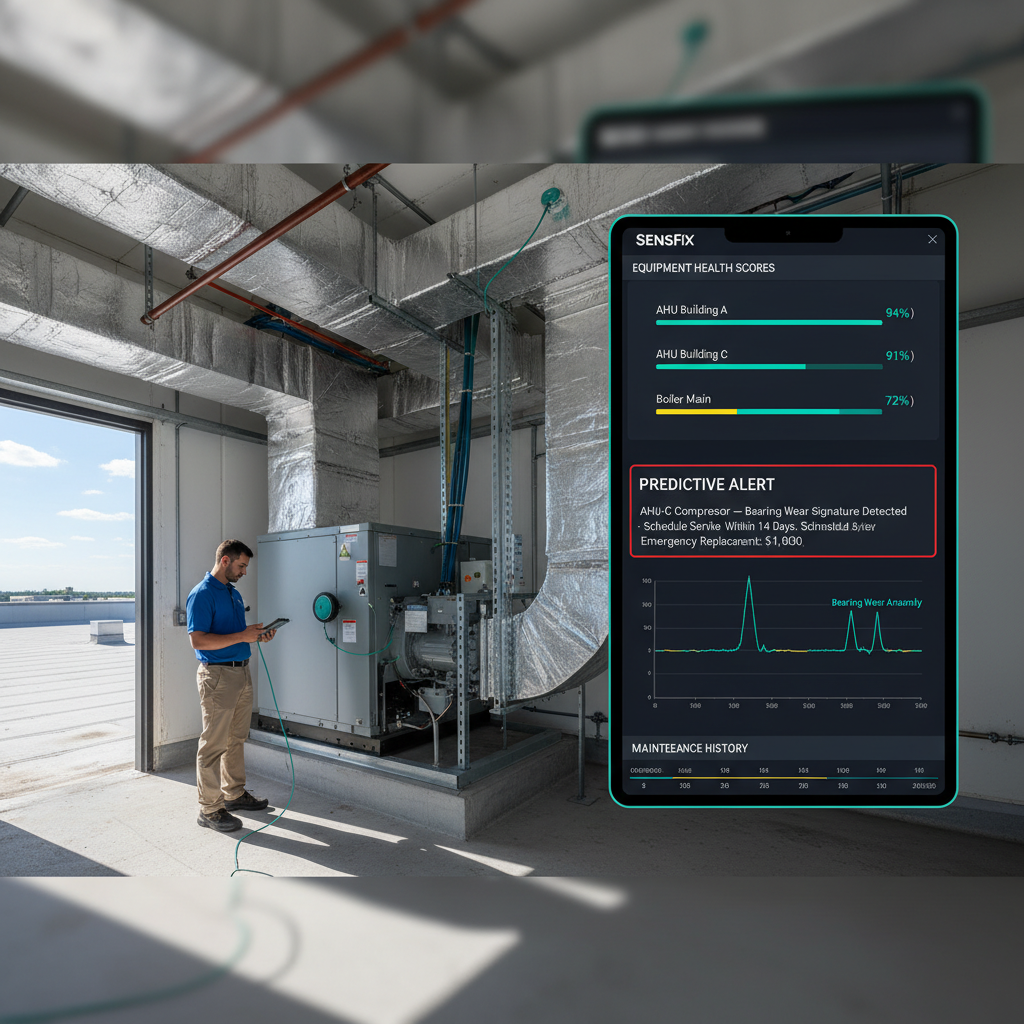Sensfix Audio AI Rule Engine, proven at the world’s second-largest train manufacturer for compressor monitoring on rolling stock, compares real-time equipment sounds against factory-reference recordings. Anomalies (bearing wear, compressor strain, motor imbalance) are detected weeks before failure. A single prevented boiler failure saves $50,000–$200,000.