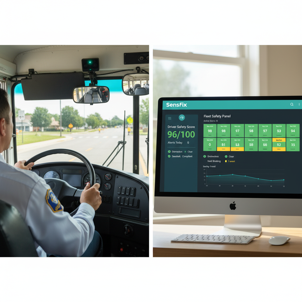 Rule engine triggers instant alerts to transportation coordinators with severity scores and video clips. The difference from dedicated dash cam solutions: Sensfix delivers driver monitoring alongside bus interior safety, fleet maintenance, and facility operations. One platform for the entire district.