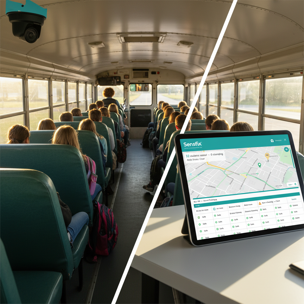 Sensfix CV analytics on existing interior bus cameras, the same object detection and behavioral analysis proven at Port of Tampa and commercial buildings. CV detects standing students, aisle obstructions, and aggressive behavior without facial recognition.