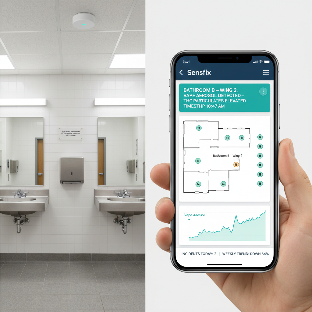 The Multimodal Rule Engine integrates IoT environmental sensor data (air quality, particulates) for vape detection. HALO-style sensors feed directly into Sensfix’s rule engine for centralized alerting. One platform handles bathroom monitoring alongside HVAC, maintenance, and every other facility need.
