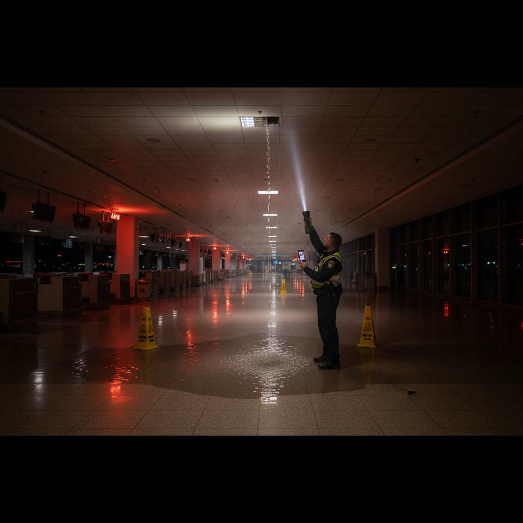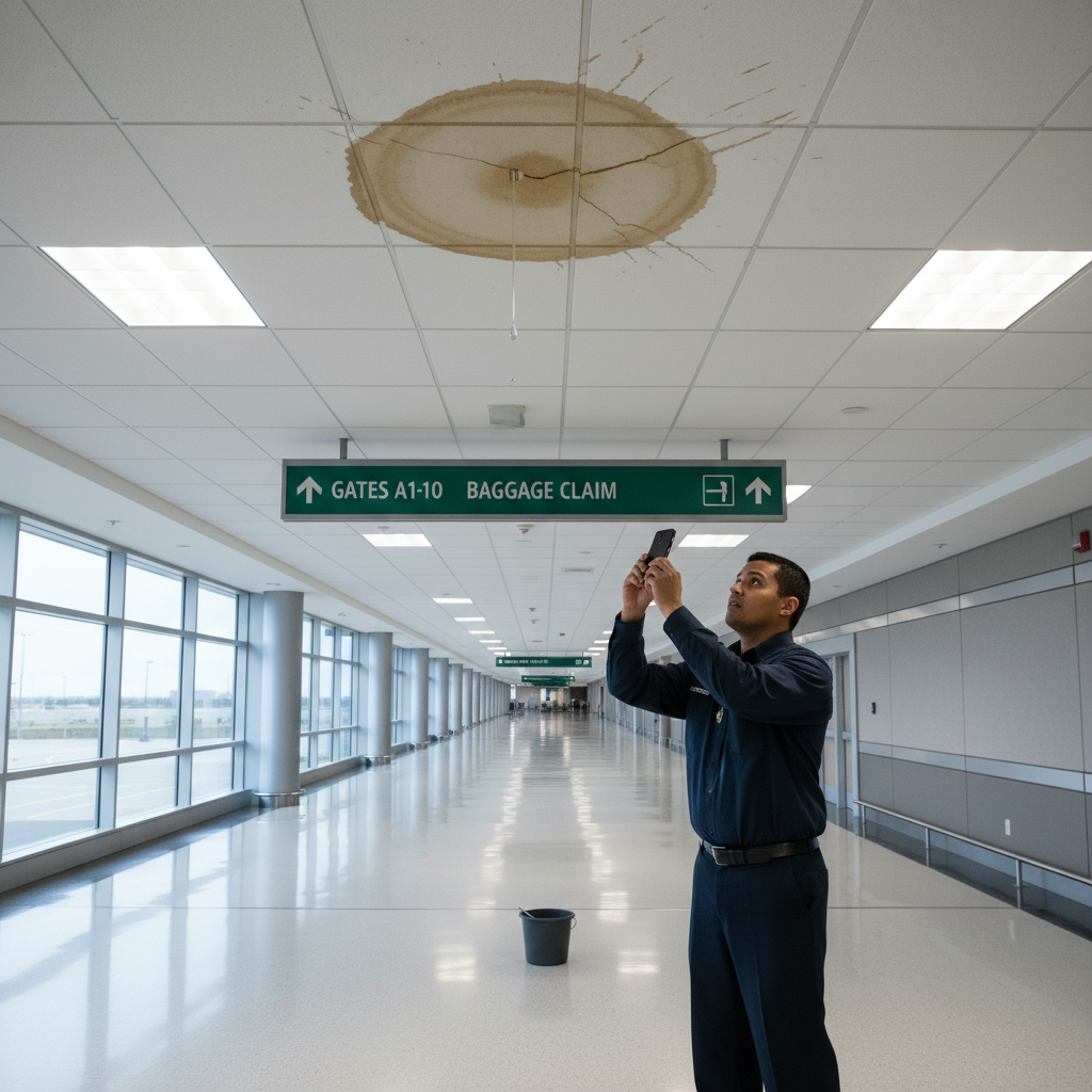 Airport security personnel patrol terminals, parking structures, and perimeters continuously. They encounter broken lighting, damaged floor tiles, water leaks, malfunctioning doors, and fence damage. But these non-security facility issues are reported informally via radio, creating an undocumented chain. Issues fall through the cracks between security and maintenance departments.