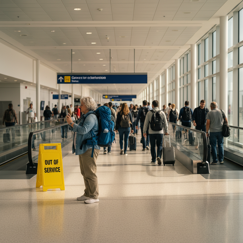 Denver International has 321 conveyances, many 25+ years old. Passengers report seeing broken units '90% of the time.' Miami had ~50 of ~600 units non-functional at one point. 56% of reported escalator accidents in Los Angeles occurred at LAX. Emergency step-chain failure repair costs $25,000–$60,000.