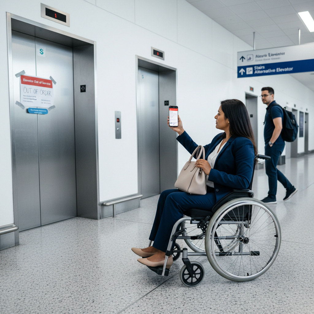 An elevator outage at an airport is an ADA Title III violation. 54% of travelers contend with some physical or cognitive challenge affecting their facility experience. Blocked ramps, broken automatic door openers, and inaccessible restrooms create legal exposure ($75,000 first violation, $150,000 subsequent) and exclude a significant passenger population.